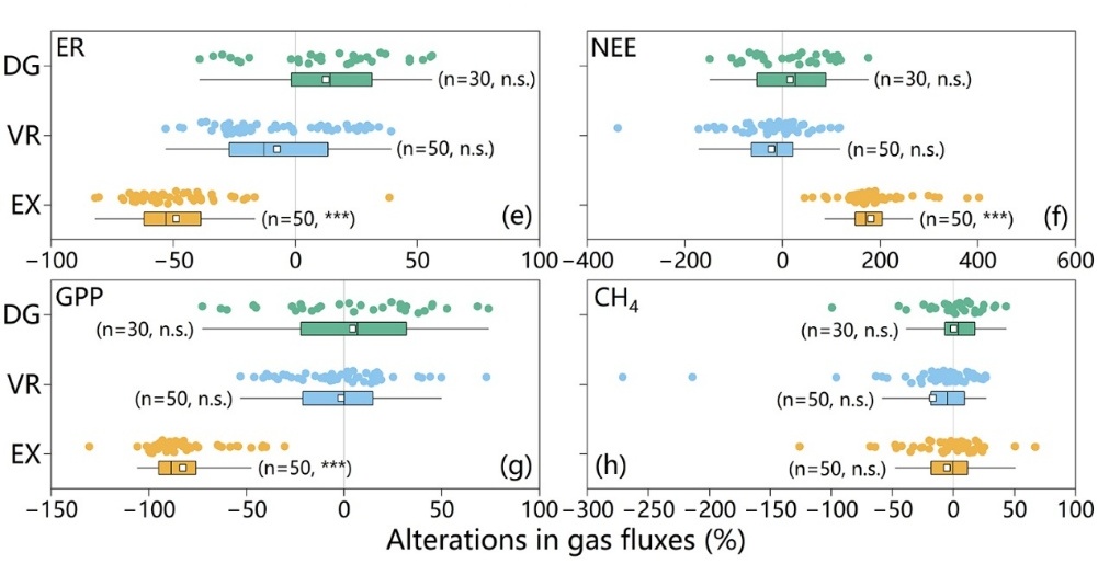 研究表明,熱融滑塌顯著削弱了高寒草地的碳匯功能。與未擾動區(qū)域相比,在植被被剝蝕的裸露地表,生態(tài)系統(tǒng)呼吸降低了49%,而總初級生產(chǎn)力則下降82%,導(dǎo)致凈生態(tài)系統(tǒng)交換增加181%,由碳匯完全轉(zhuǎn)變?yōu)樘荚?。雖然裸露地表表現(xiàn)出持續(xù)的CH4吸收,但其吸收量級遠不足以抵消額外排放的CO2。