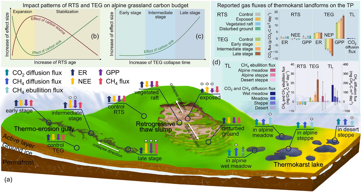 中國科學(xué)院西北生態(tài)環(huán)境資源研究院冰凍圈科學(xué)與凍土工程全國重點實驗室研究團隊聯(lián)合蘭州大學(xué)、丹麥哥本哈根大學(xué)以及中國科學(xué)院植物研究所,于2024和2025年在青藏高原腹地開展系統(tǒng)性溫室氣體通量觀測,量化了熱融滑塌所導(dǎo)致的通量變化以及研究區(qū)域的碳收支平衡,為評估氣候變化背景下青藏高原多年凍土碳反饋提供了關(guān)鍵證據(jù)。