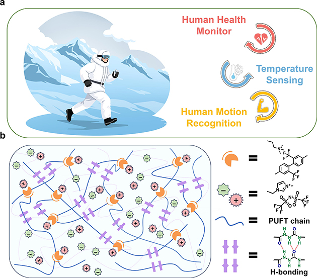 為探索聚氨酯材料的應(yīng)用潛力,基于上述研究,研究人員對(duì)聚氨酯材料內(nèi)部分子網(wǎng)絡(luò)設(shè)計(jì)和功能化進(jìn)行深入研究。為實(shí)現(xiàn)材料的導(dǎo)電性,引入更多具有額外極性的極性鍵是一種可能的策略,如碳-氟(C-F)鍵。由于F原子的高電負(fù)性,C-F鍵的強(qiáng)靜電性質(zhì)會(huì)增強(qiáng)進(jìn)入體系的電子極性,這樣陰離子和陽離子可彼此分布得更遠(yuǎn),在聚合物內(nèi)部移動(dòng)更自由?;诖?,研究人員提出了一種分子工程范式,利用氟的雙重功能在聚氨酯基質(zhì)中構(gòu)建空間相關(guān)但功能獨(dú)立的動(dòng)態(tài)網(wǎng)絡(luò)。通過引入含氟擴(kuò)鏈劑和多氫鍵單元,構(gòu)建了氟-陽離子相互作用與高密度氫鍵協(xié)同的動(dòng)態(tài)網(wǎng)絡(luò),氟的高電負(fù)性不僅與封端劑形成離子鍵增強(qiáng)網(wǎng)絡(luò)穩(wěn)定性,還通過偶極相互作用固定陽離子,構(gòu)建陰離子傳輸通道,保障離子高效遷移。從而成功制備了一種具備超敏感多參數(shù)監(jiān)測(cè)功能,可用于極地可穿戴設(shè)備形狀記憶聚氨酯材料。