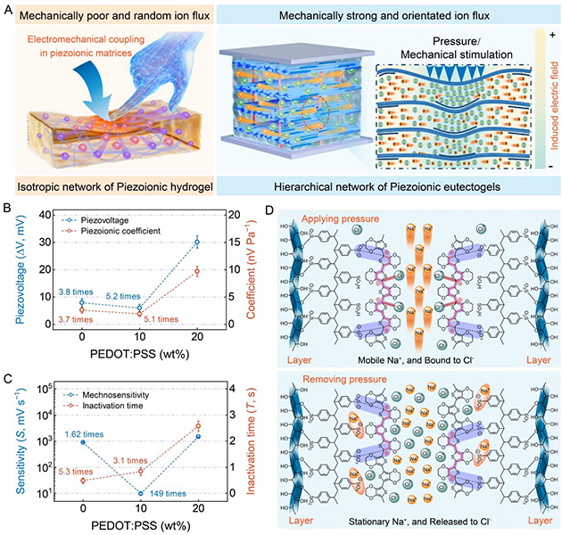 課題組通過機(jī)械訓(xùn)練構(gòu)建層級(jí)互穿的納米纖維網(wǎng)絡(luò)結(jié)構(gòu),不僅實(shí)現(xiàn)了多尺度能量耗散機(jī)制強(qiáng)韌化了力學(xué)屬性,而且為壓力驅(qū)動(dòng)的離子流提供了定向遷移通道,降低了離子壓電水凝膠中未受約束的離子遷移必須克服三維網(wǎng)絡(luò)的空間阻力。分子尺度上,在離子壓電凝膠網(wǎng)絡(luò)中引入PEDOT:PSS作為Na+和Cl–的電荷補(bǔ)償受體,產(chǎn)生離子?電子的電荷補(bǔ)償反應(yīng),實(shí)現(xiàn)非對(duì)稱陰、陽離子傳輸動(dòng)力學(xué)。如圖1所示,在施加壓力下,Cl–作為PEDOT骨架上空穴的主要電荷補(bǔ)償載體可以有效延伸電子傳輸鏈以加速Na?遷移,從而放大了Na+與Cl–之間的遷移率差,產(chǎn)生敏感的離電響應(yīng)電壓;而當(dāng)壓力釋放時(shí),PSS鏈上–SO3–基的Na+鍵合位點(diǎn)被激活,可有效阻礙Na+逆向遷移,增強(qiáng)離子失活動(dòng)力學(xué),產(chǎn)生可持續(xù)的離電效應(yīng)。