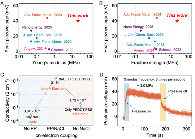 圖2. 離子壓電凝膠的離電性能和力?電綜合性能的對(duì)比。