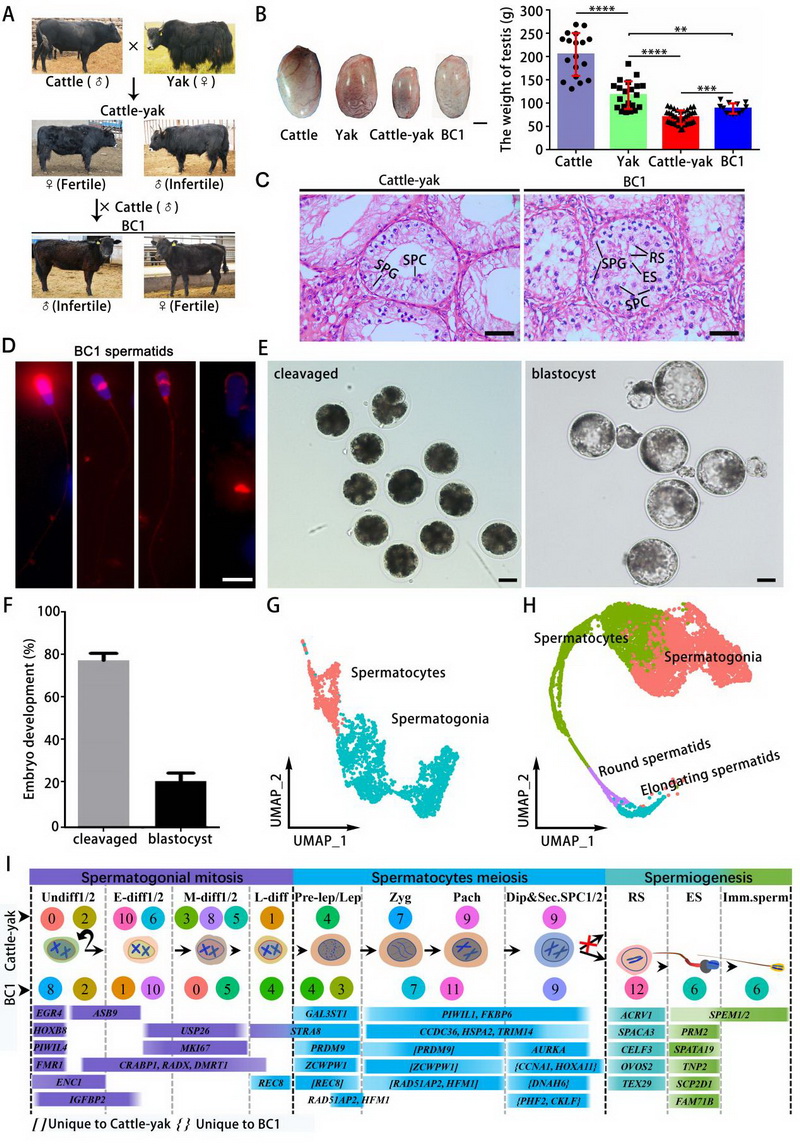 論文代表圖1:普通牛和牦牛雜交后代和回交睪丸組織單細(xì)胞圖譜分析。A) 普通牛與牦牛雜交產(chǎn)生犏牛及其回交后代(BC1)的模型示意圖。B) 牦牛、家牛、犏牛及BC1的睪丸重量對(duì)比,比例尺 = 2 厘米;普通牛(n = 18)、牦牛(n = 21)、犏牛(n = 37)和BC1(n = 13)的睪丸重量進(jìn)行兩兩比較。C) 犏牛(左)和BC1(右)睪丸組織的蘇木精-伊紅(H&E)染色切片。比例尺 = 50 μm。在犏牛中未觀察到精母細(xì)胞階段以后的生精細(xì)胞,而與犏牛相比,BC1的生精缺陷有所緩解。SPG:精原細(xì)胞,SPC:精母細(xì)胞,RS:圓形精子細(xì)胞,ES:伸長(zhǎng)精子細(xì)胞。D) 從BC1睪丸中分離出的精子細(xì)胞頂體染色。比例尺 = 10 μm。E & F) BC1精子細(xì)胞胞質(zhì)內(nèi)注射入牦牛卵母細(xì)胞后獲得了部分卵裂期胚胎和囊胚期胚胎;比例尺 = 50 μm。G) 犏牛生殖細(xì)胞的UMAP標(biāo)注圖,僅識(shí)別出兩種亞型:精原細(xì)胞和精母細(xì)胞。H) BC1生殖細(xì)胞的UMAP標(biāo)注圖,識(shí)別出精原細(xì)胞、精母細(xì)胞、圓形精子細(xì)胞和伸長(zhǎng)精子細(xì)胞。I) 犏牛和BC1生殖細(xì)胞各簇中特定標(biāo)記基因的表達(dá)情況,可用于細(xì)胞類(lèi)型鑒定。