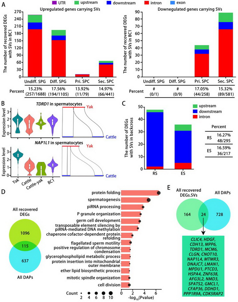 論文代表圖2:普通牛、牦牛、犏牛及BC1各類(lèi)生殖細(xì)胞亞型中攜帶基因組結(jié)構(gòu)變異的差異表達(dá)基因。A) 柱狀圖顯示在犏牛精原細(xì)胞和精母細(xì)胞各亞群中,具有結(jié)構(gòu)變異且表達(dá)上調(diào)或下調(diào)、但在BC1中表達(dá)得以恢復(fù)的基因數(shù)量。B) 代表性基因的小提琴圖及其結(jié)構(gòu)變異的示意圖。C) 柱狀圖顯示與牦牛和普通牛相比,在BC1各類(lèi)精子細(xì)胞亞型中攜帶基因組結(jié)構(gòu)變異的差異表達(dá)基因數(shù)量。D) 對(duì)BC1精母細(xì)胞中所有表達(dá)水平恢復(fù)的差異表達(dá)基因,與犏牛精母細(xì)胞中的差異豐度蛋白進(jìn)行韋恩圖分析及GO富集分析。E) BC1精母細(xì)胞中所有表達(dá)恢復(fù)的差異表達(dá)基因、具有結(jié)構(gòu)變異的差異表達(dá)基因,以及犏牛精母細(xì)胞中所有差異豐度蛋白的韋恩圖分析。