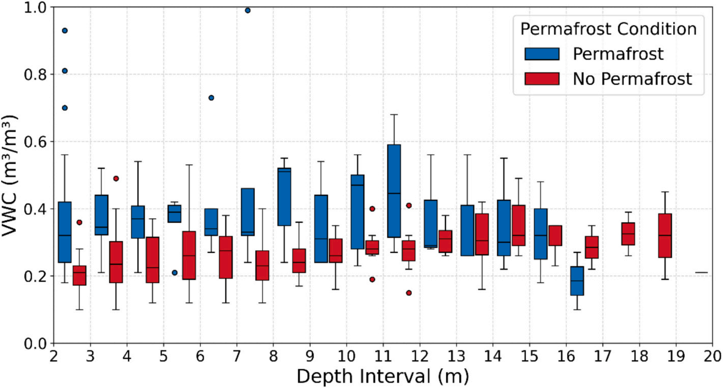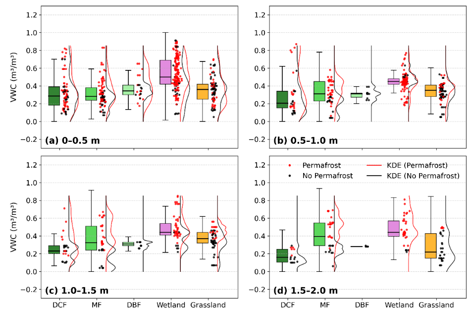 研究團(tuán)隊(duì)在根河流域布設(shè)75個(gè)淺層土壤剖面和15個(gè)深達(dá)20米的鉆孔,獲取了覆蓋森林、草地、濕地等不同下墊面的土壤含水量觀測(cè)數(shù)據(jù)。并結(jié)合可解釋機(jī)器學(xué)習(xí)與結(jié)構(gòu)方程模型,系統(tǒng)揭示了邊緣多年凍土區(qū)土壤水分的“垂向分層”特征及其控制機(jī)制。