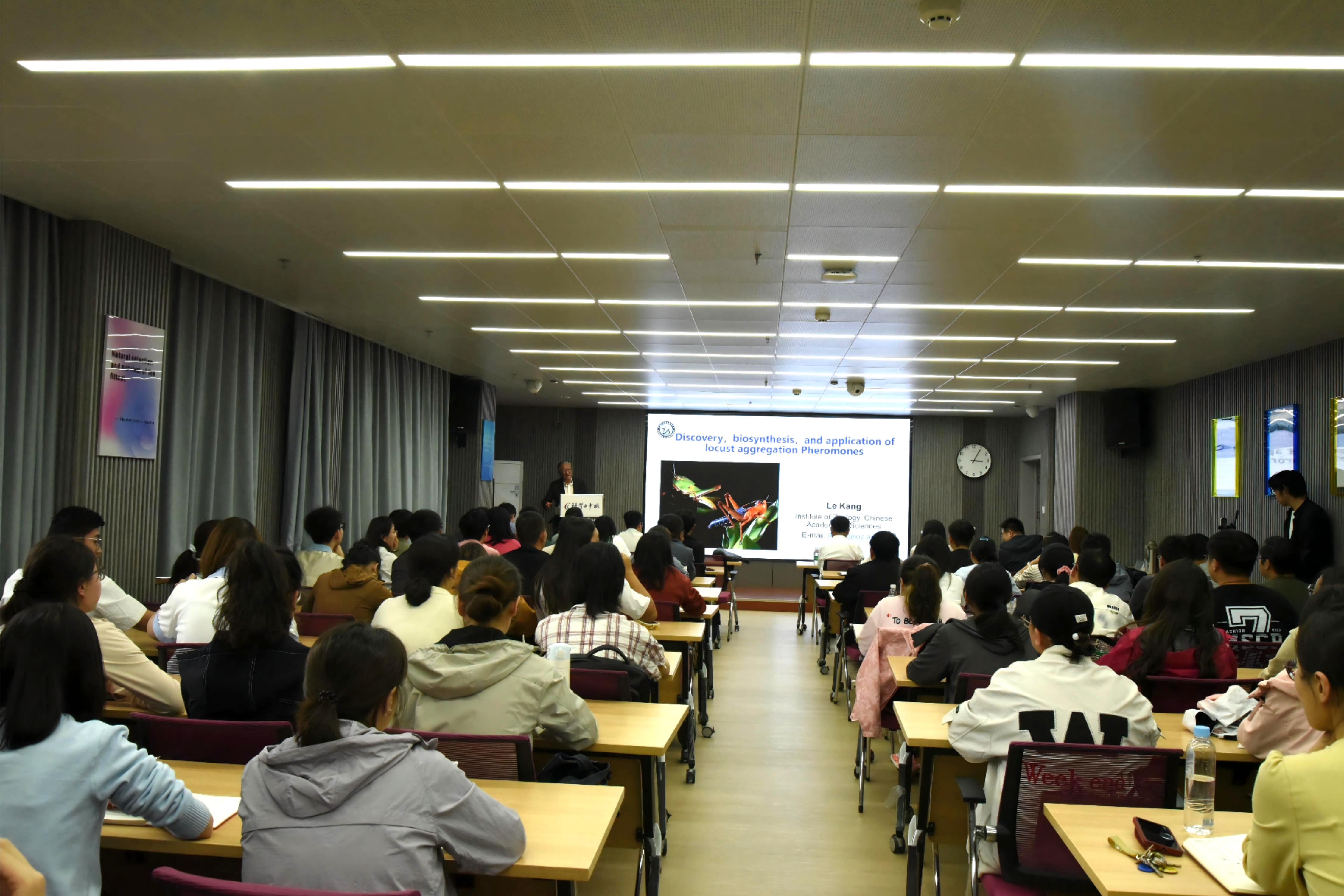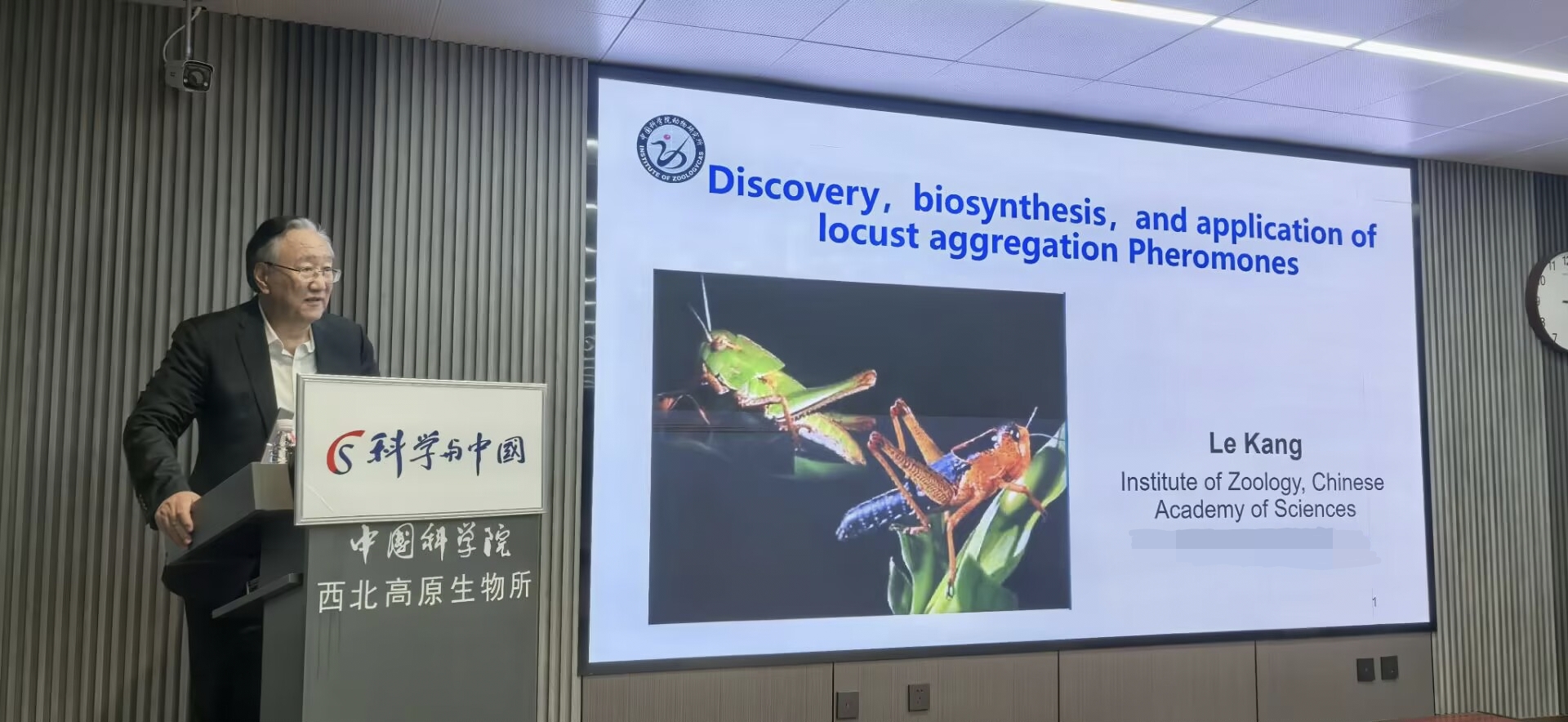 為領(lǐng)略科學(xué)前沿,拓展學(xué)術(shù)視野,點(diǎn)燃科學(xué)創(chuàng)新熱情,8月30日下午,中國(guó)科學(xué)院西北高原生物研究所舉辦了主題為“蝗蟲群聚信息素的發(fā)現(xiàn)、生物合成與應(yīng)用”學(xué)術(shù)報(bào)告會(huì)。中國(guó)科學(xué)院院士康樂受邀擔(dān)任主講嘉賓。西北高原所副所長(zhǎng)楊其恩主持報(bào)告會(huì)并致辭,西北高原所所長(zhǎng)陳世龍出席,辦公室主任王文娟,人事教育處副處長(zhǎng)楊紅霞,以及百余名師生聆聽。