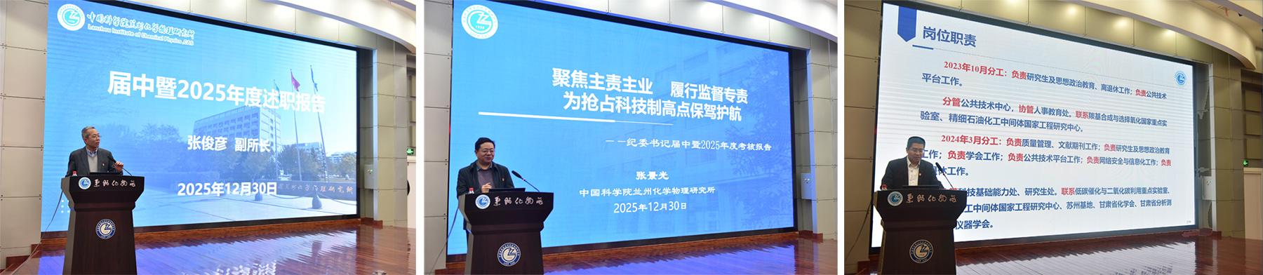 蘭州化物所副所長(zhǎng)張俊彥、紀(jì)委書(shū)記張景光、副所長(zhǎng)石峰分別就各自分管工作作了述職報(bào)告。