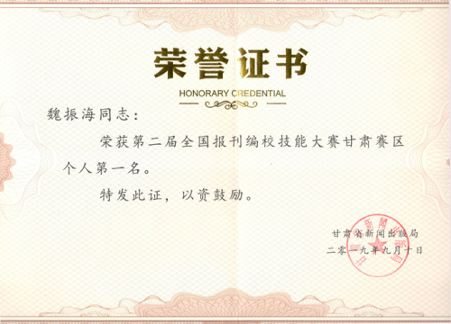 魏振海獲第二屆全國報刊編校技能大賽甘肅賽區(qū)初賽第一