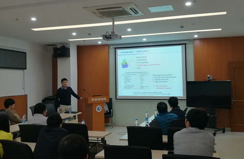 報告中,王恒博士闡述了平面超分子領(lǐng)域的研究進(jìn)展,詳細(xì)介紹了三種不同代數(shù)(G2-G4)二維平面超分子配體的模塊化合成策略及其自組裝,展示了“配體合成與自組裝一鍋法”的簡便高效合成方法?;谕S六元環(huán)的三維棱柱的構(gòu)筑過程及其自組裝的機(jī)理,可將此類平面超分子拓展至三維立體結(jié)構(gòu)。報告后,王恒博士同與會人員就巨型超分子領(lǐng)域的研究進(jìn)行了討論與交流。