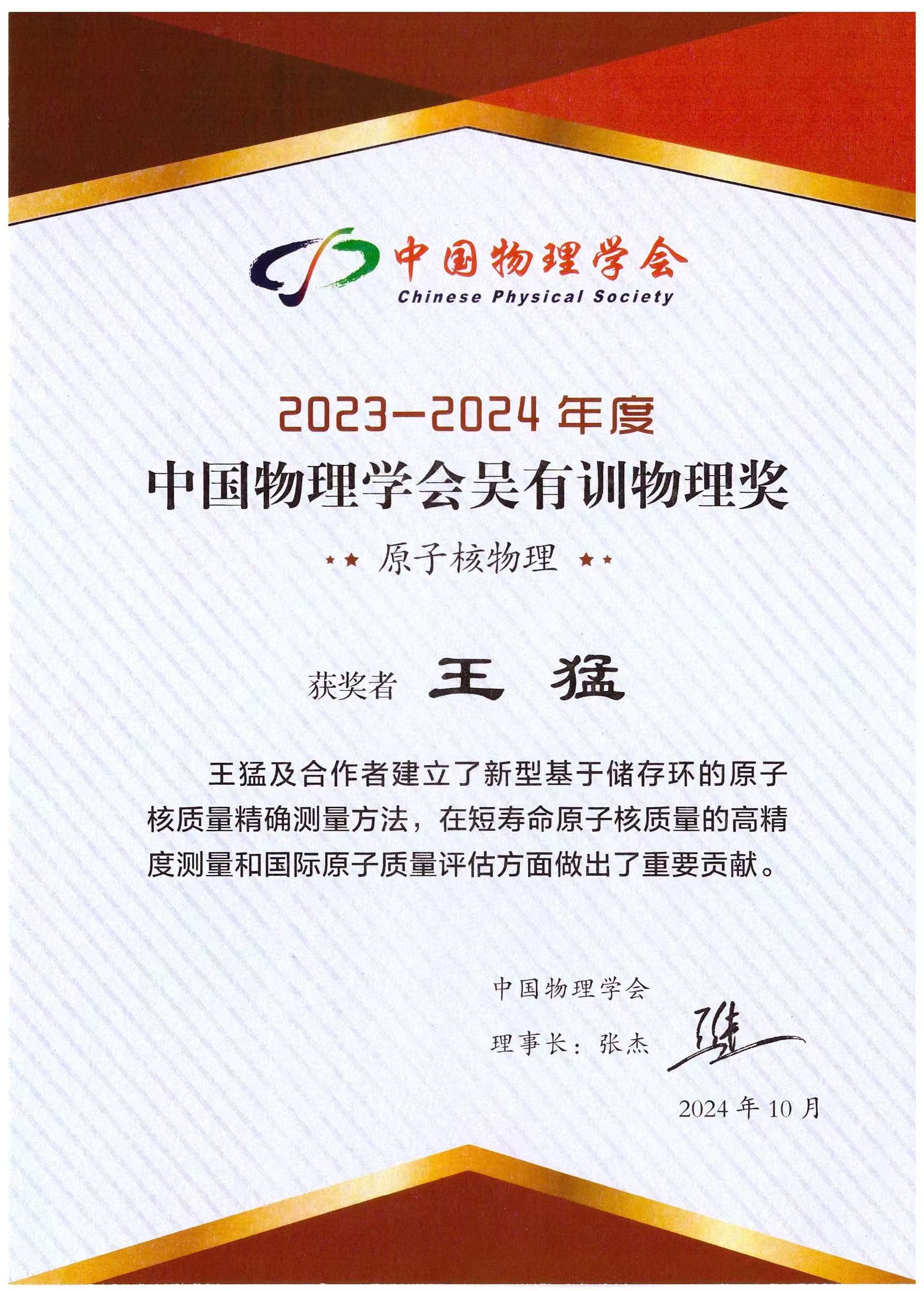 10月10日至13日,中國物理學會2024秋季學術(shù)會議在海南國際會展中心舉行。開幕式上舉行了2023-2024年度中國物理學會五項物理獎頒獎儀式,中國科學院近代物理研究所副所長王猛研究員榮獲吳有訓物理獎(原子核物理)。?